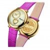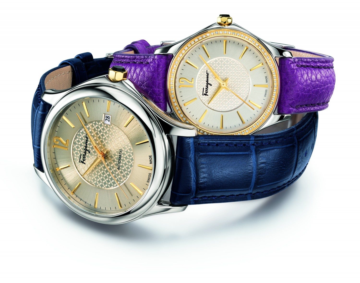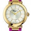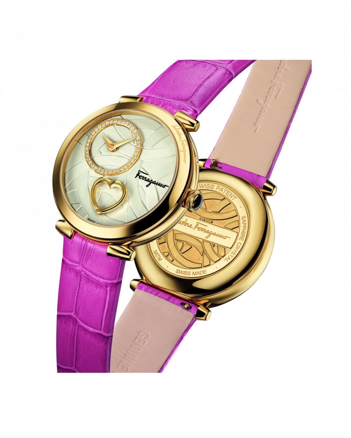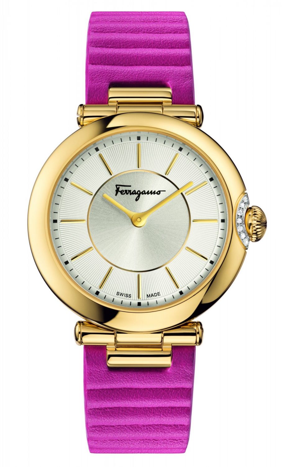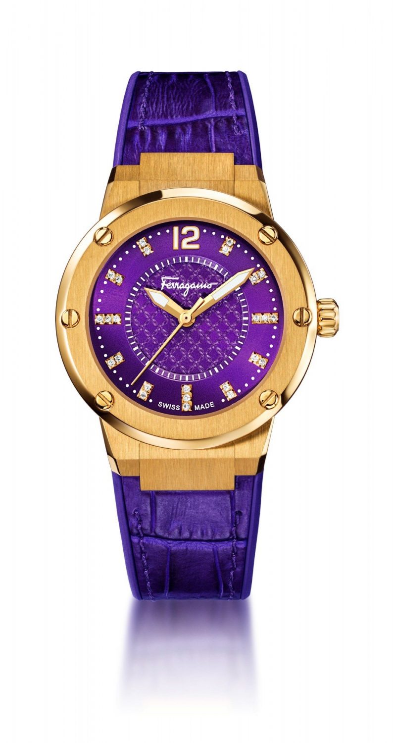 The round case contains a silver dial adorned with the iconic Gancino. The off-centre hours and minutes indicator is embellished by a circle of diamonds or an engraved Clou de Paris motif. Cuore Ferragamo is available with a bi-colour bracelet or a crocodile print calfskin strap in one of a sophisticated palette of colour shades: yellow, black, red, purple, pink and grey.