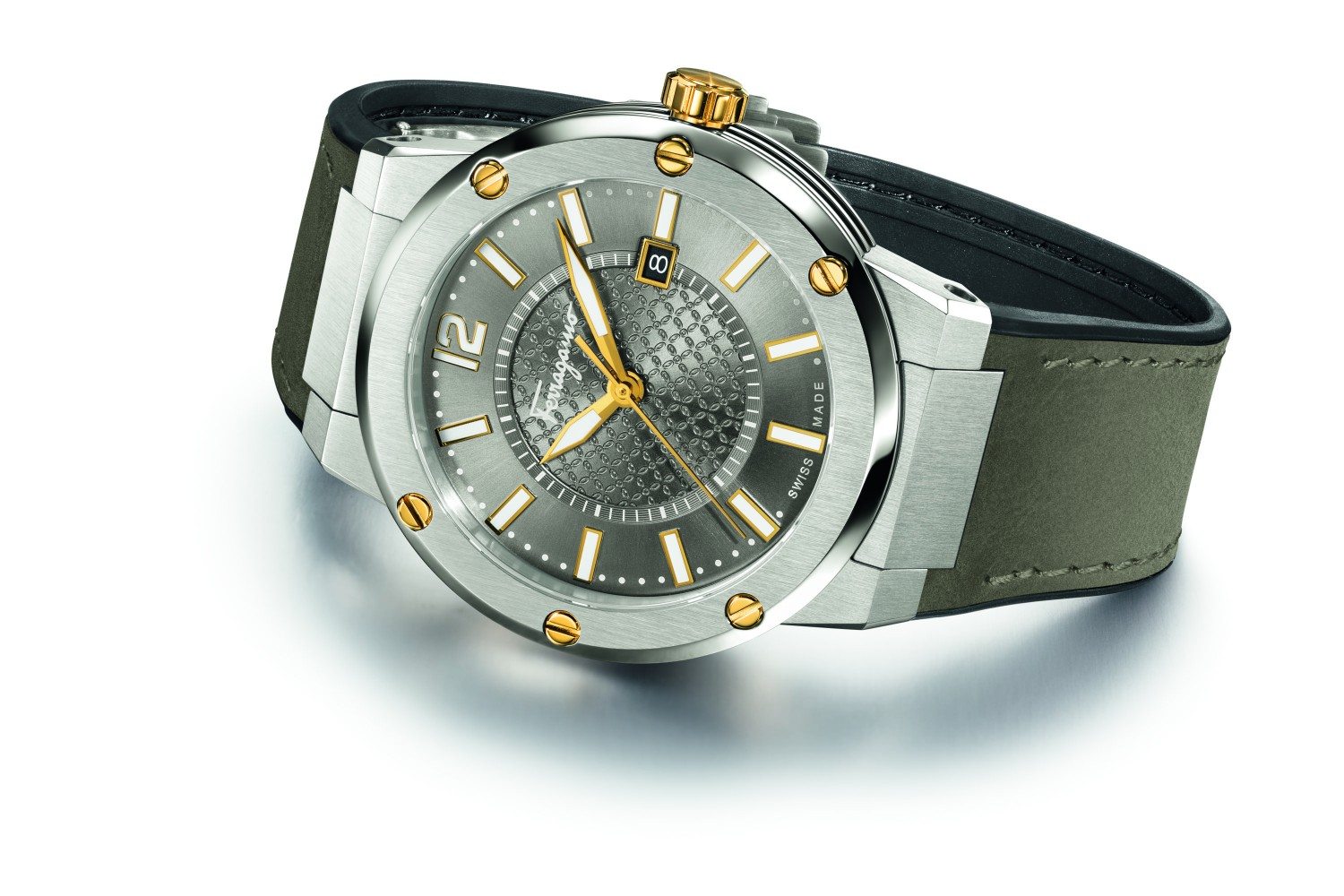 The secret is an innovative quartz movement, designed and manufactured exclusively for Salvatore Ferragamo. Pressing the crown starts the function, while the time is set with a button at 2 o’clock using a special heart-shaped tool.