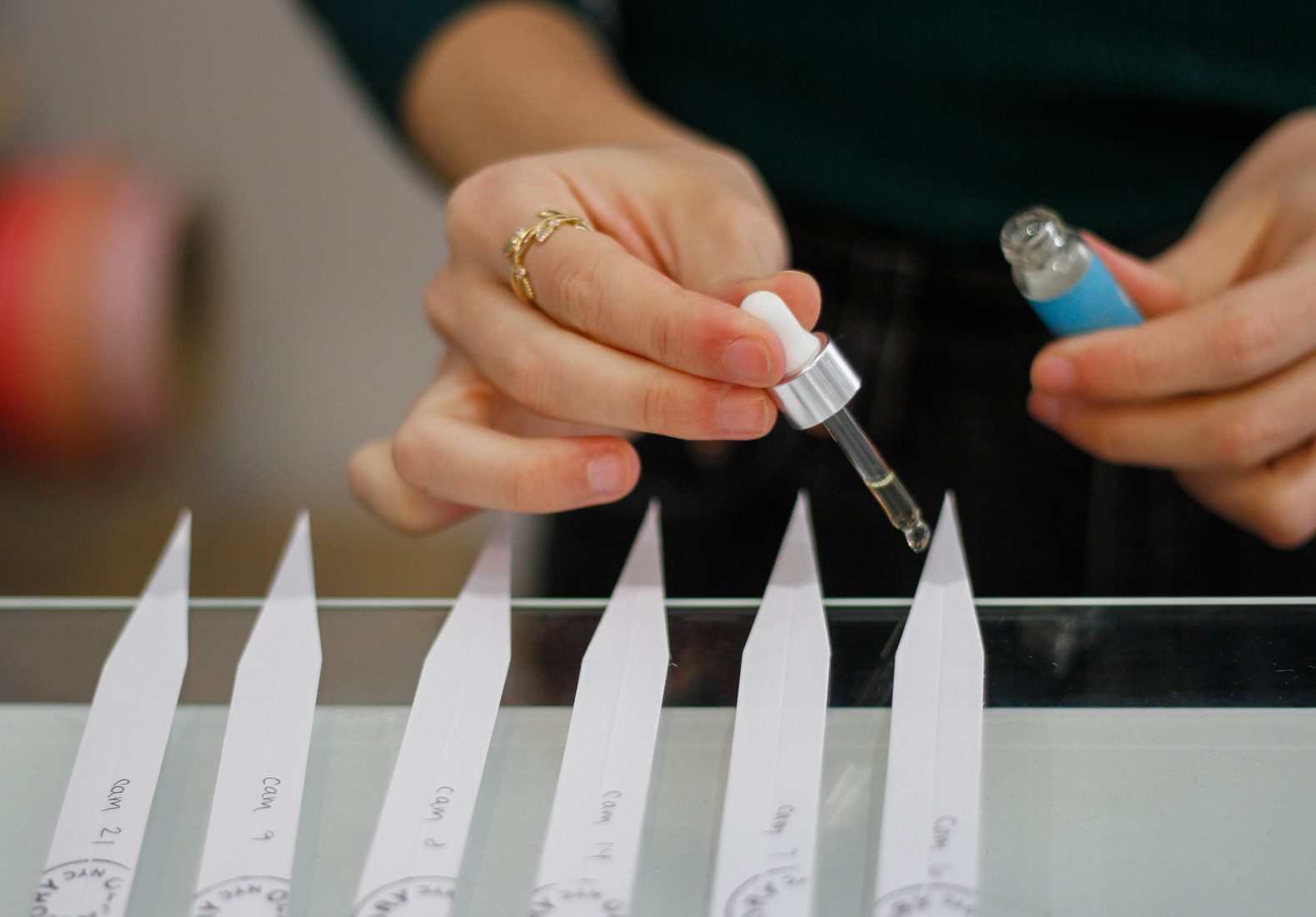 After choosing your two favorites, you are presented with perfume cards with the various combinations of the base and accords. You select which scents you enjoy the most, choose up to four combinations, and test the blends on your skin to see how they react to your personal chemistry.