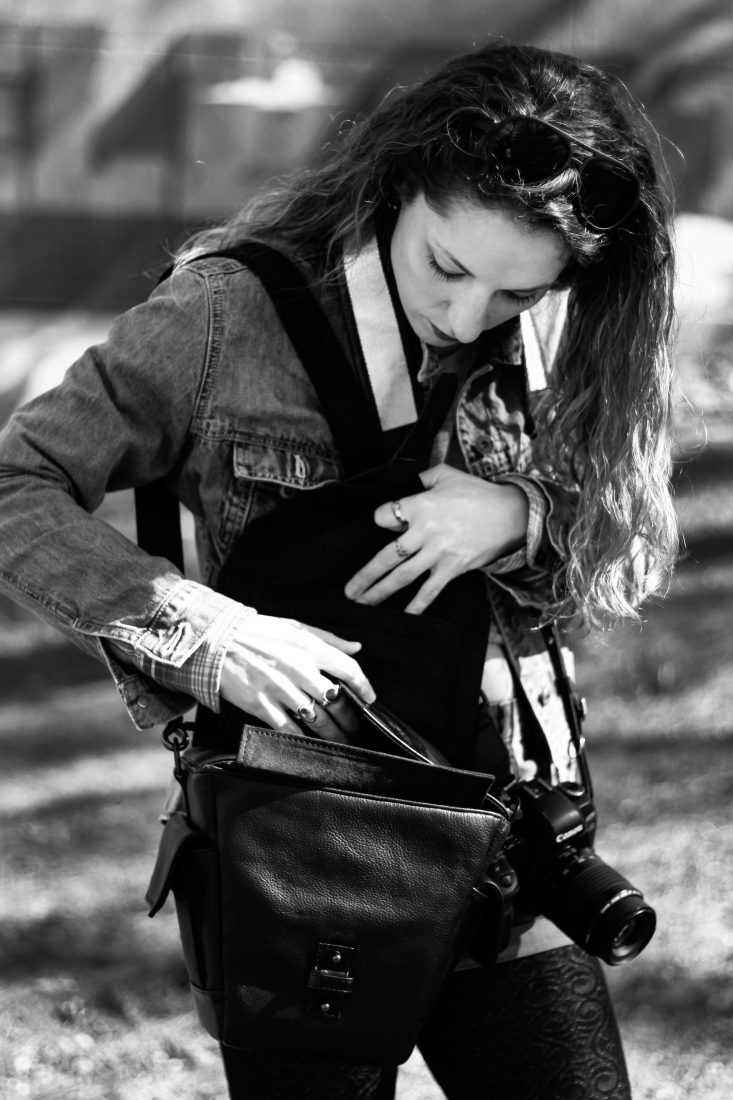 The depth of the bag makes up for the usual standard: Katie’s DSLR and a 80-200mm easily fit inside; there wasn’t room to store many other lenses, besides a spare nifty fifty or 35mm, or one telephoto. But as far as protection goes, it’s absolutely stellar, feels rock n’ roll, and the included strap is comfortable.