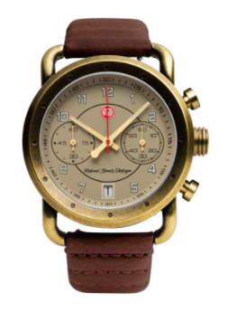 ICON Roland Sands Signature 2254 Chronograph. 43mm 316L Stainless Steel Case and Fixed Bezel with IP Antique Gold Plating, Stainless Steel Push Crown, and Screw-In Caseback. K1 Flat Hardened Mineral Crystal. Japan Quartz (Miyota 6S21) 2 Eye Chronograph with Date Movement.