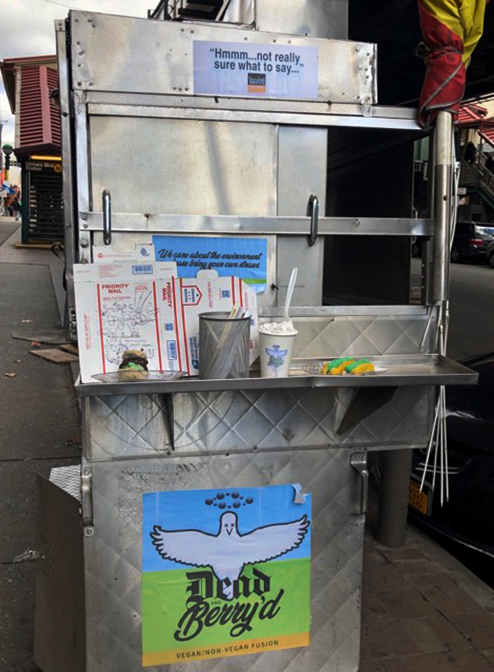 Dead and Berry’d appeared on 31st Street at an abandoned hot dog cart under the Ditmars stop this week. Its tasty “vegan/non-vegan fusion” offerings have certainly been tantalizing the block!