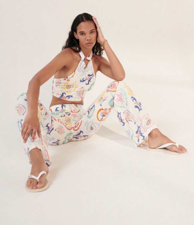Three criteria for trendy summer pants: wide leg, printed, and filled with color. These Zara pants will have heads turning wherever you wear them. (Note the accompanying halterneck top!)
