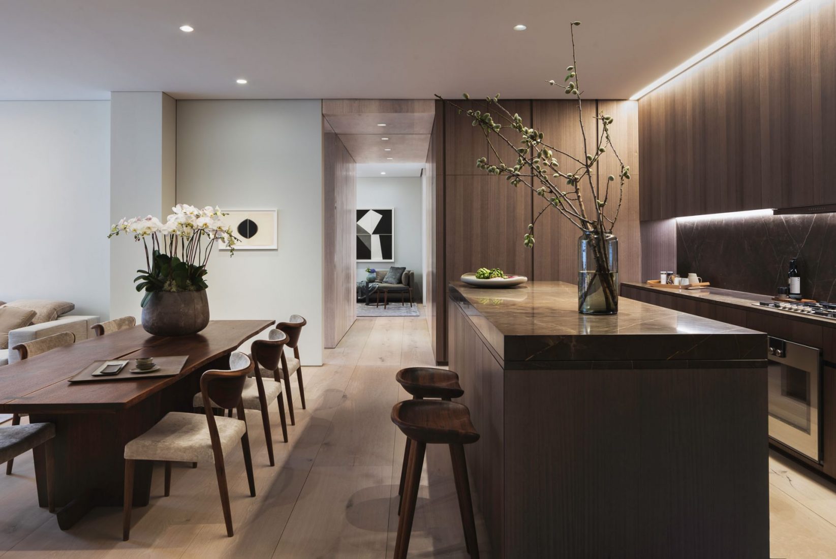 Tucked away in Manhattan’s West Chelsea neighborhood, Jardim is the first U.S. residential development by Isay Weinfeld, the world-renowned Brazilian architect and interior designer. With Jardim, Weinfeld has elevated its kitchens to the realm of finely crafted furniture. Doors and walls are wrapped in honey-hued American oak, with matching Italian-made cabinetry by Molteni. The islands also feature extra-deep double sinks, as well as built-in dishwashers and wine refrigerators—creating a professional-grade workspace that is as practical as it is striking.