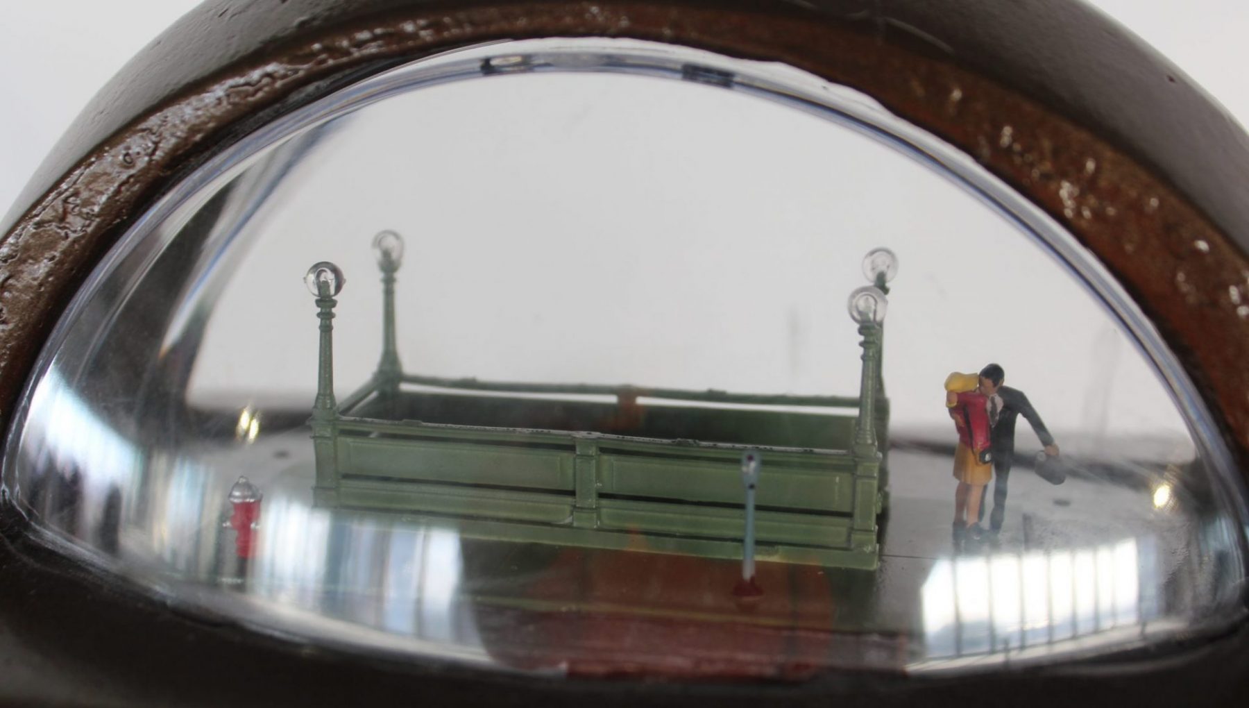 Stojak cuts the heavy shells open in order to build the dioramas inside, then reassembles the meters. He paints them in a mix of spray paint and enamel. Some of the meters have many layers of paint. The dioramas are created mostly from tiny figures from model train kits that he buys online. Some contain found objects. In addition, Stojak found an online source for the glass domes.