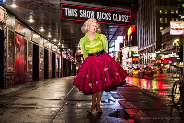 RF: My designer Ryan Moller and I have a great creative relationship. We spend a lot of time working on the look, feel and design of the costumes. I go to him with ideas of designs, colors, textures and such, and he draws up some designs which we then work on until we both agree. He often is out shopping for fabrics for one of the many other shows he designed and sees something and takes a picture and messages me immediately to say, “Hey, I think this is a Doris Dear print!” Especially important is the scale of things. I am a 6’4″, 210-pound, broad-shouldered man. At 7’2″ in heels and hair, everything from the length of the skirt to how high the collar on my blouse stands up counts. From a distance, it should be hard to tell exactly how big I truly am. The hair is also important. I have my wigs handmade and styled by my hair designer Gerard Kelly. He does an amazing job. Again, it is about scale and form so it fits the character. We base most of my hair on my mothers pictures from the time.
