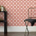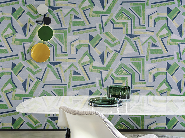Michele Varian in her Howard Street shop (Above). Below, leather-clad mirrors and tableware by DBO Home, in front of wallpaper designed by Varian and printed by Chambord in Hoboken New Jersey.