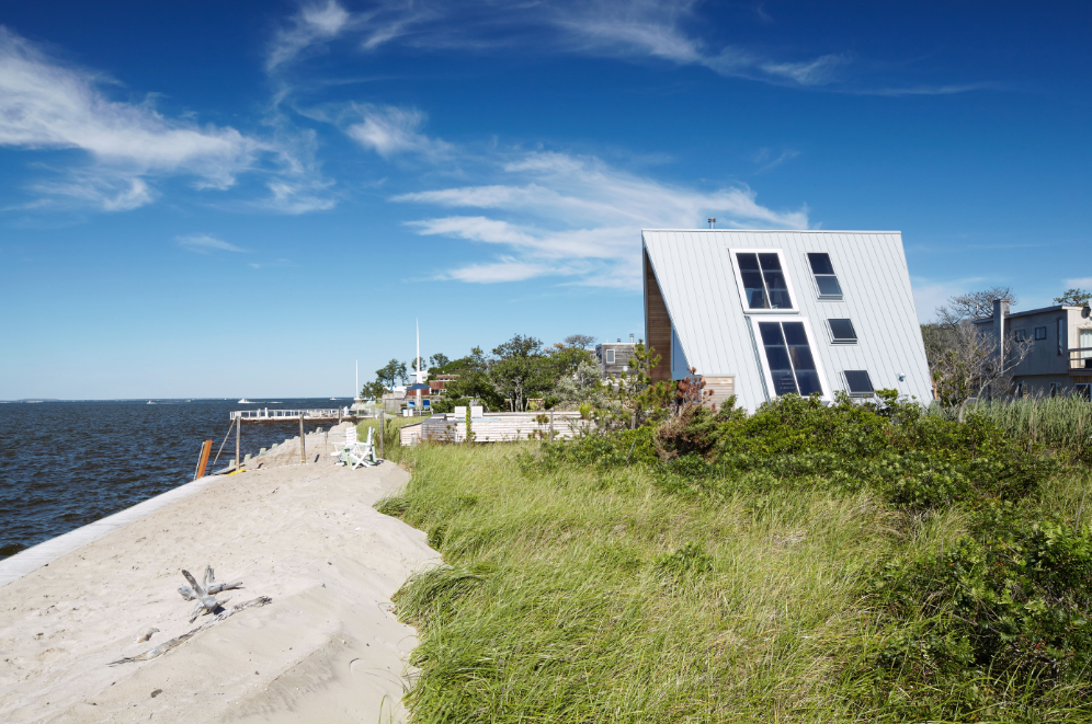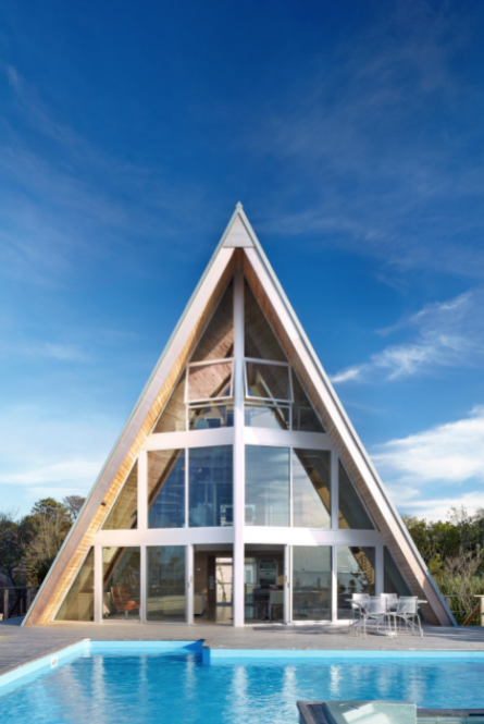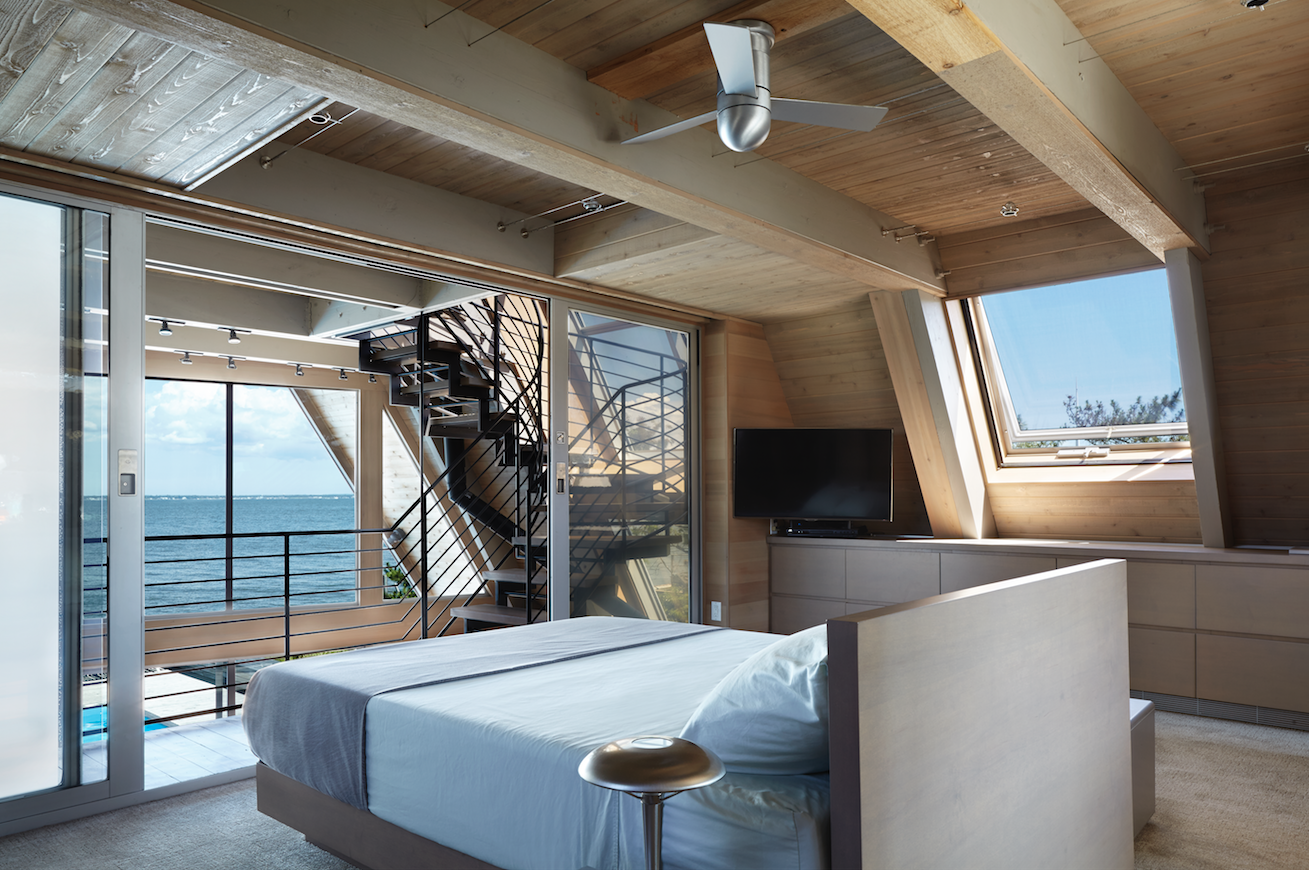 IN A TOP-TO-BOTTOM RENOVATION of a bay-side A-frame home on Fire Island, Bromley Caldari turned a seasoned beach rental into a sleek, modern hide-out. Rethinking the iconic 1960s A-frame form, architects R. Scott Bromley and Jerry Caldari broke through the envelope of the building to weave a sculptural staircase through the airy three-story structure. Working with local builder Walter Boss, the team made preserving the surrounding natural habitat and pristine views a priority.